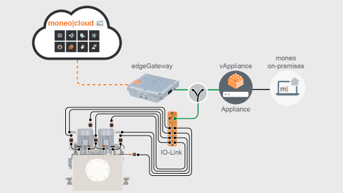 To monitor the numerous components and relevant measured variables of a hydraulic power unit, moneo is installed via an edge gateway.