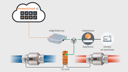 The moneo software allows you to monitor your cooling circuit either by installing it on a server (locally or in a virtual environment) or by using it directly in the moneo Cloud. An IO-Link master is connected to the internal network (VLAN). Two flow meters are installed in the feed and return lines of the cooling circuit and are used to monitor the amount of cooling water required.