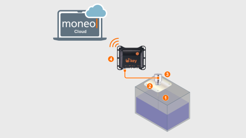 Monitoring a natural water well and its water level involves a number of challenges. Where no network infrastructure is available, the io-key can be used, eliminating the need for manual checks on site. The io-key transmits the data from the connected sensors to moneo via mobile communications. In addition to the LR3020 level sensor, this application requires a E43380 launching plate and a E43353 probe (length: 2 m).*